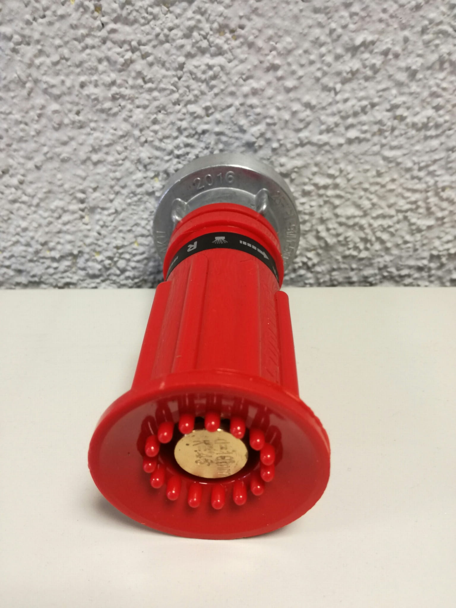 Prądownica umożliwia regulację rodzaju strumienia i wydajności przez obrót części chwytowej wykonanej z tworzywa sztucznego ABS w kolorze czerwonym RAL 3000.