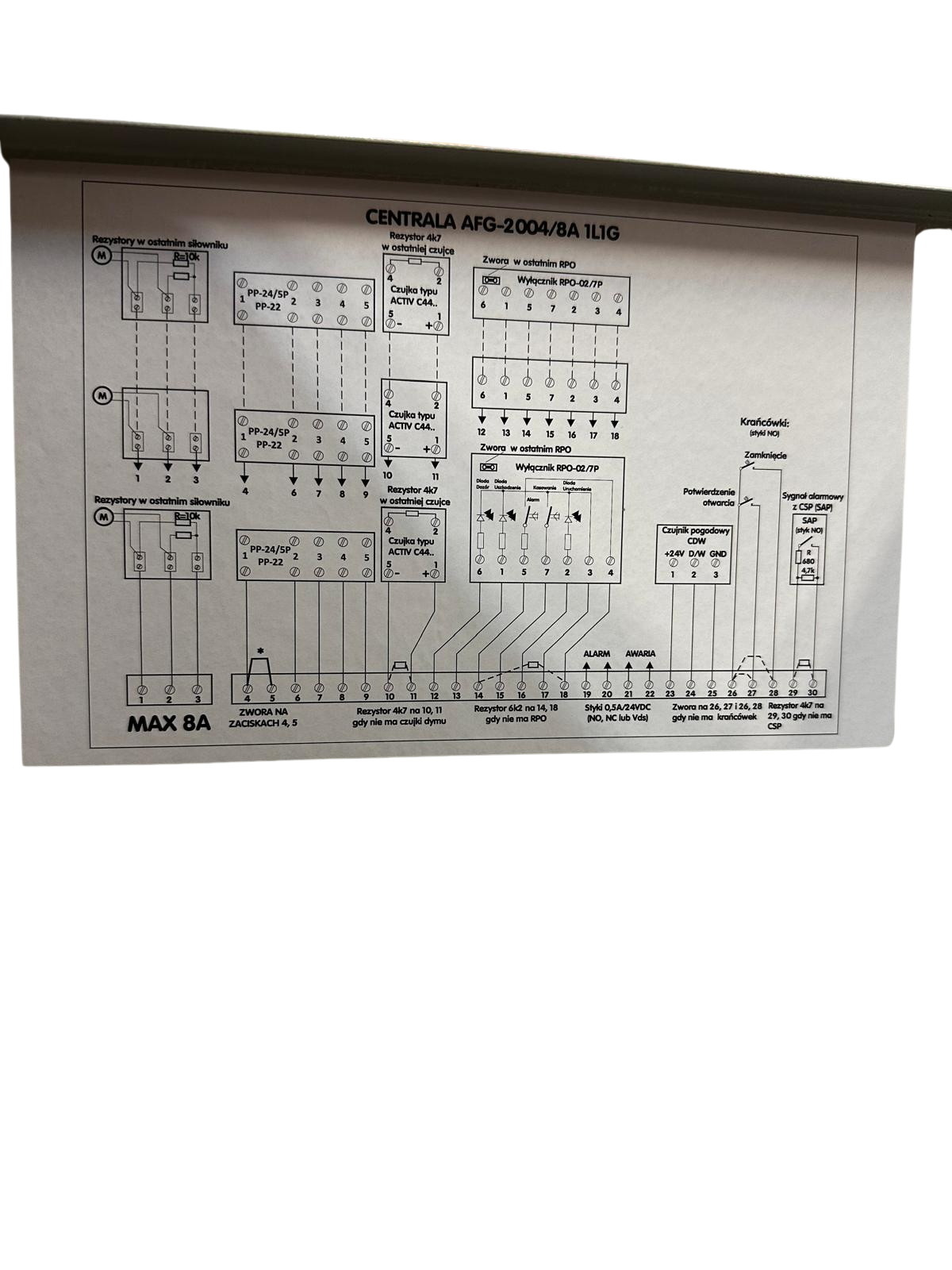 Centrala sterująca typu AFG2004/8A 1L1G to podstawowy i autonomiczny element składowy systemu oddymiania i przewietrzania. Centrala ta steruje i dostarcza energię elektryczną o napięciu 24V DC do między innymi: napędów klap i okien oddymiających, zatrzasków elektromagnetycznych klap pneumatycznych i klap wentylacji przeciwpożarowej, napędów drzwi napowietrzających, napędów kurtyn dymowych, styczników wentylatorów oddymiających i napowietrzających. Poprzez tą centralę można realizować następujące czynności: