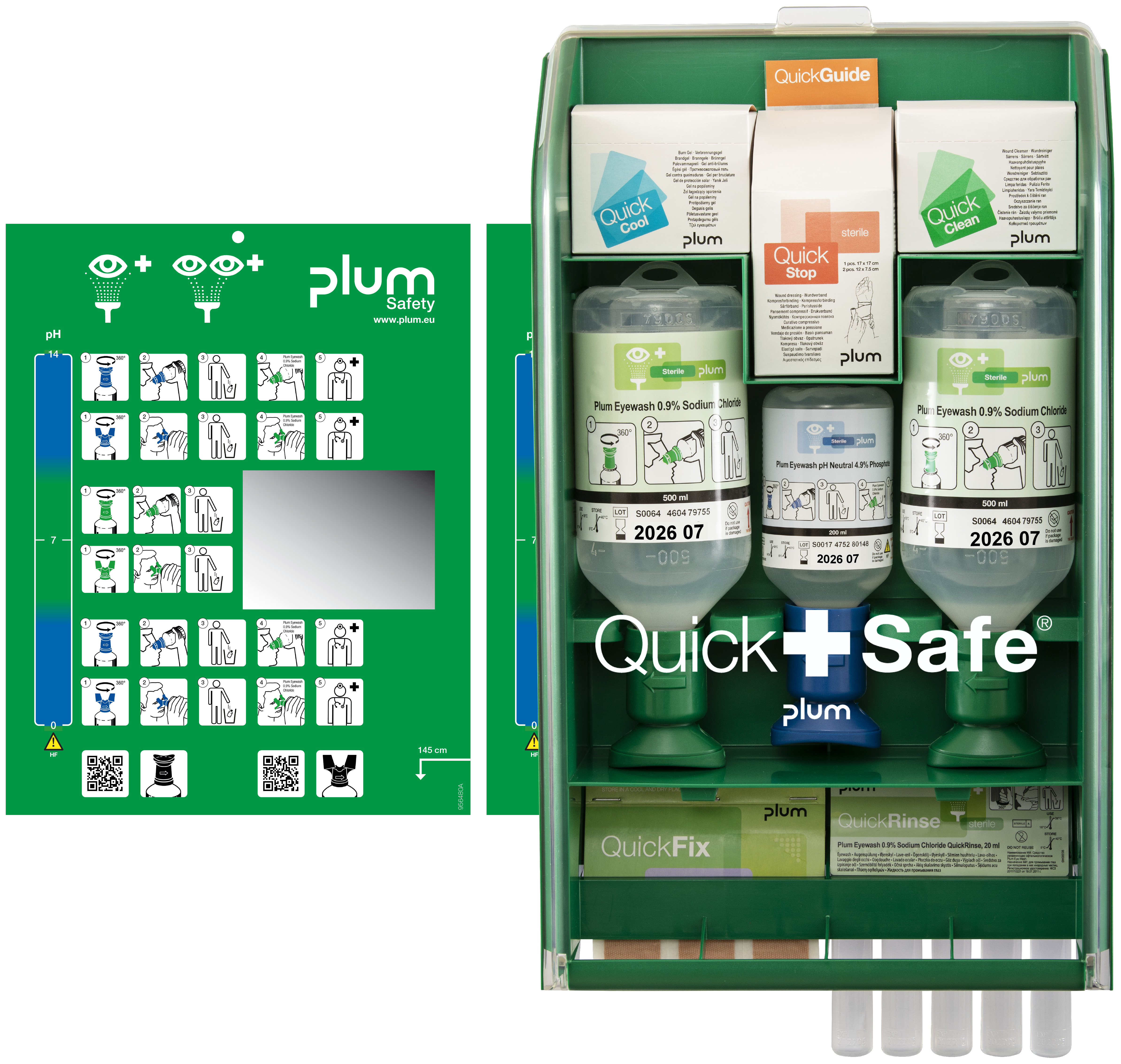 To najszersza, gotowa konfiguracja z serii QuickSafe: płukanie oczu (izotoniczne NaCl oraz pH Neutral 4,9%), szybkie oczyszczanie i zabezpieczanie ran, a także łagodzenie oparzeń – wszystko w jednym, widocznym punkcie.