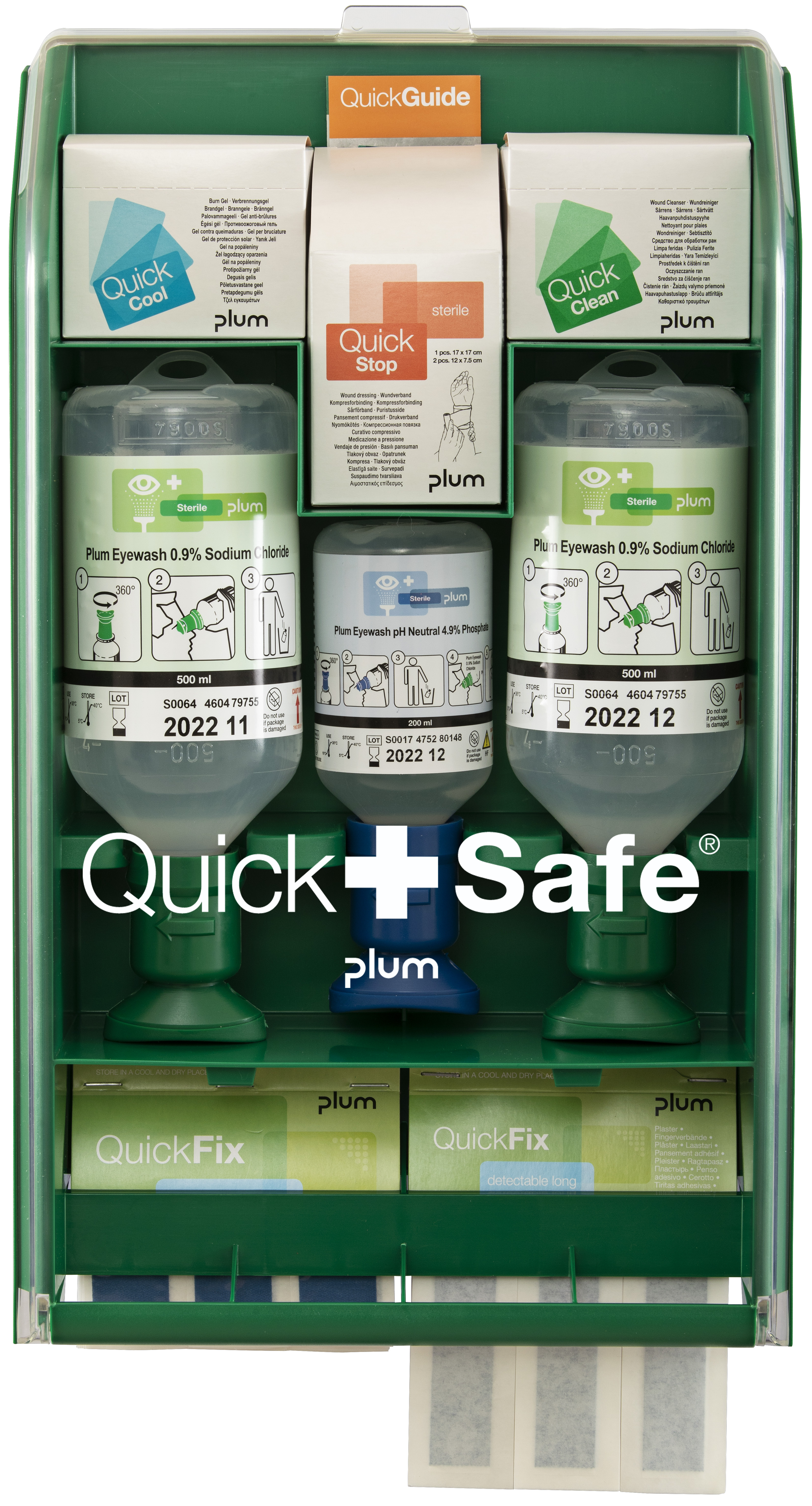 Apteczka pierwszej pomocy Plum QuickSafe Food Industry – ścienna stacja z przezroczystą pokrywą do zakładów branży spożywczej. W komplecie m.in. płyn do płukania oczu 0,9% NaCl (2×500 ml), płuczka do oczu pH Neutral 4,9% (200 ml), niebieskie plastry wykrywalne QuickFix (45 + 30), QuickClean (20), QuickCool (18) i zestaw opatrunkowy QuickStop.
