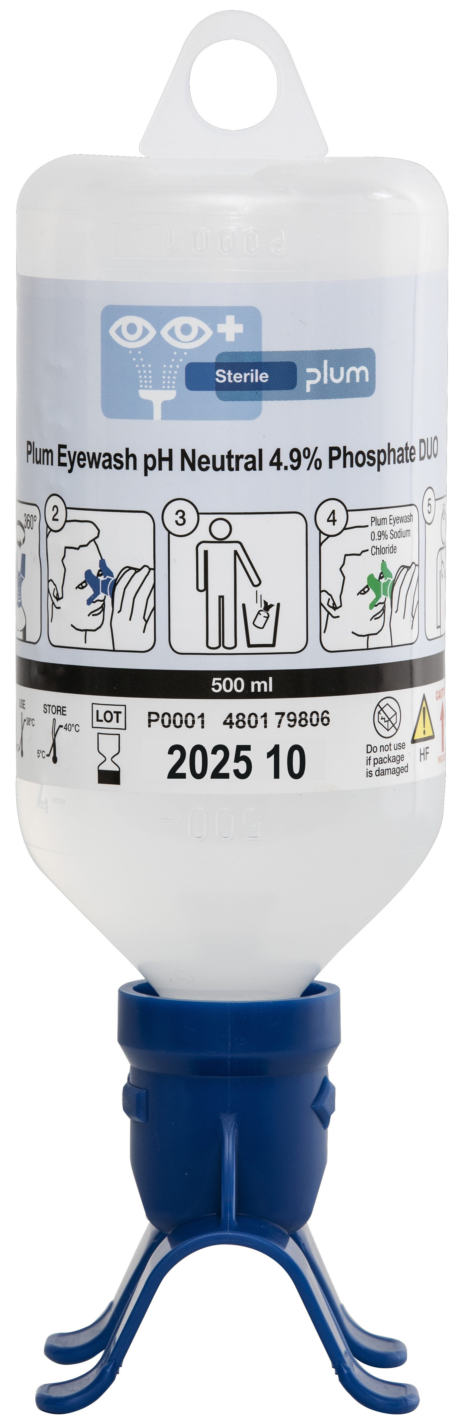 Płuczka do kwasów i zasad – Plum pH Neutral 500 ml (bufor fosforanowy 4,9%) z końcówką DUO; po neutralizacji kontynuuj płukanie 0,9% NaCl.