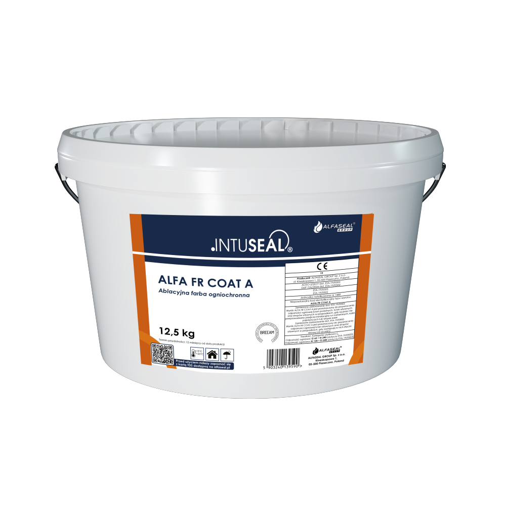 Ablacyjna farba ALFA FR COAT A jest jednoskładnikowym produktem przeznaczonym do uszczelnienia instalacyjnych przejść ppoż. oraz zabezpieczenia dylatacji przeciwpożarowych do odporności ogniowej max EI240 (szczegóły wg dokumentów odniesienia). W warunkach pożaru pod wpływem oddziaływania wysokiej temperatury w wyrobie zachodzą reakcje endotermiczne. Farba pochłania ciepło w znacznym stopniu opóźniając wpływ ognia na elementy konstrukcyjne. Produkt stosowany jest w połączeniu z płytą z wełny mineralnej o gęstości min. 150 kg/m3 i grubości min. 60mm w przypadku przejść instalacyjnych, gęstości min.50kg/m3 w przypadku dylatacji. W sprzedaży dostępne są również gotowe/pomalowane płyty ogniochronne ALFA FR BOARD A.