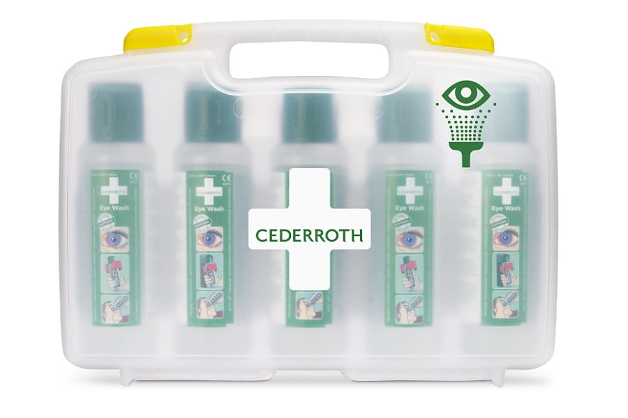Walizka z płukankami do oczu Cederroth 5 x 500 ml REF 51011042 to idealne rozwiązanie wszędzie tam, gdzie może dojść do zaprószenia lub ochlapania oczu niebezpiecznymi substancjami lub pyłami. Oprócz wypłukiwania ciał stałych oraz rozcieńczania i wypłukiwania niebezpiecznej substancji, roztwór Cederroth neutralizuje wpływ zasad i kwasów. Płukanki w praktycznej walizce można zabierać ze sobą, na przykładu do pracy w terenie, mogą też posłużyć do płukania w czasie transportu poszkodowanego do szpitala. Duże znaczenie ma rozpoczęcie płukania oka w pierwszych sekundach po wypadku, płukanka Cederroth zapewnia obfity strumień roztworu, a końcówka w kształcie wanienki zapewnia kierowanie go prosto do oka, bez rozlewania na boki. Końcówka jest wyprofilowana i pasuje do oka pomagając utrzymać je otwartym podczas procesu płukania.